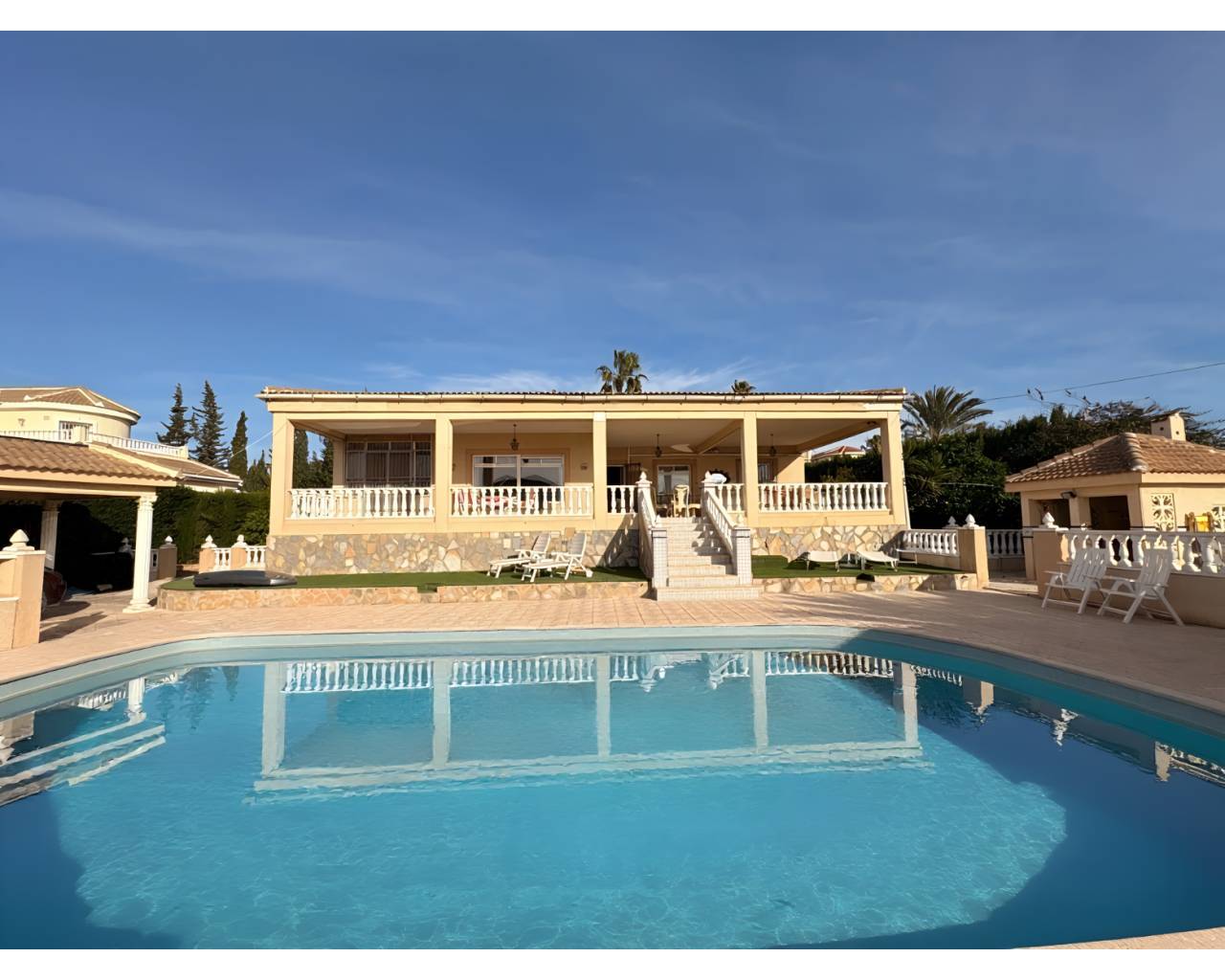 Esta villa independiente disfruta de una ubicación privilegiada con impresionantes vistas abiertas al Lago de La Mata, combinando naturaleza, privacidad y una excelente orientación sureste que garantiza luminosidad durante todo el día. Situada a tan solo 5 minutos andando de Old Don Carlos, en la zona de Arcos de Ciudad Quesada, la propiedad representa una oportunidad única por ubicación y precio. La vivienda se asienta sobre una parcela de 1.000 m² y cuenta con 250 m² construidos, además de 70 m² de terrazas diseñadas para disfrutar del entorno natural y de las vistas al lago. Dispone de 4 habitaciones, 2 baños, siendo uno de ellos en suite en el dormitorio principal, ofreciendo comodidad y una distribución equilibrada para la vida familiar. El salón, amplio y luminoso, se abre hacia el paisaje con vistas directas al lago, creando un ambiente relajante y exclusivo. La terraza principal también goza de estas vistas panorámicas, convirtiéndose en el espacio ideal para comidas al aire libre, descanso o reuniones sociales. En el exterior, la propiedad ofrece una piscina privada de 5 x 10 metros, rodeada de zonas ajardinadas con sistema de riego automático, y espacios pensados para disfrutar del clima mediterráneo durante todo el año. Además, dispone de aparcamiento privado subterráneo, aportando seguridad y comodidad. Una villa que combina vistas, amplitud y ubicación estratégica, ideal tanto como residencia habitual, segunda vivienda o inversión, en una de las zonas más demandadas de la Costa Blanca. Clima: El clima en la Costa Blanca, a menudo considerado como el mejor de Europa, hace posible un estilo de vida muy sociable y saludable, al aire libre, marcado por instalaciones deportivas y de ocio, con ciudades turísticas, excitantes y cosmopolitas, que destacan por la prestación de servicios máxima categoría, algunos de ellos exclusivos, considerados de auténtico lujo. Todos ellos destinados a un cliente exigente, que busca calidad y cercanía. La Costa Blanca cuenta con más de 300 días de sol al año. Un paraíso con excelentes conexiones a toda Europa. El Aeropuerto de Alicante-Elche cuenta con unas modernas instalaciones y con un fácil y cómodo acceso desde cualquier punto de la provincia. Entorno: La Costa Blanca sigue atrayendo a personas de toda Europa, y de otros lugares del mundo, porque ofrece una calidad de vida única en un hermoso entorno a orillas del mar Mediterráneo, rodeado de montañas y de una exuberante vegetación. Además de los campos de golf y los puertos deportivos que podrás disfrutar por toda la costa, la zona también ofrece la posibilidad de esquiar en la cercana Sierra Nevada, Javalambre o Valdelinares, unos paraísos para amantes de los deportes de invierno, con hermosos paisajes naturales. La Costa Blanca ofrece un estilo de vida singularmente rico, donde las mejores playas y calas del Mediterráneo se combinan con un interior repleto de montañas y pueblos que esconden cultura y monumentos históricos únicos en el mundo. Creemos que tu confianza merece un trato excepcional. Estaremos a tu lado siempre que nos necesites. Tenemos un regalo para ti: Desde nuestra agencia inmobiliaria le ayudamos a convertir su nueva propiedad en la casa de tus sueños, le acompañamos a una una visita técnica del departamento de diseño a la vivienda, donde nuestro equipo técnico le aconsejará sobre las posibilidades de mejora y decoración de su propiedad. Totalmente gratis!! IMPORTANTE!! Recuerda que nuestros servicios NO incrementan NUNCA el precio final de la vivienda a nuestros clientes. Nuestra experiencia en el sector nos convertirá en tu aliado, un asesor de confianza que te ayudará a elegir la casa de tus sueños en la mejor zona, informarte sobre el precio de mercado de los inmuebles en los que estás interesado, las calidades empleadas...todo la información imprescindible y objetiva para que tu experiencia sea totalmente satisfactoria. Nuestra agencia pertenece a un grupo de empresas consolidadas y especializadas todas ellas en el sector del hogar; arquitectura, interiorismo, mobiliario, asesoramiento en la compra venta de bienes raíces, etc... Estos recursos propios nos permiten ofrecer unos servicios únicos y exclusivos a nuestros clientes.