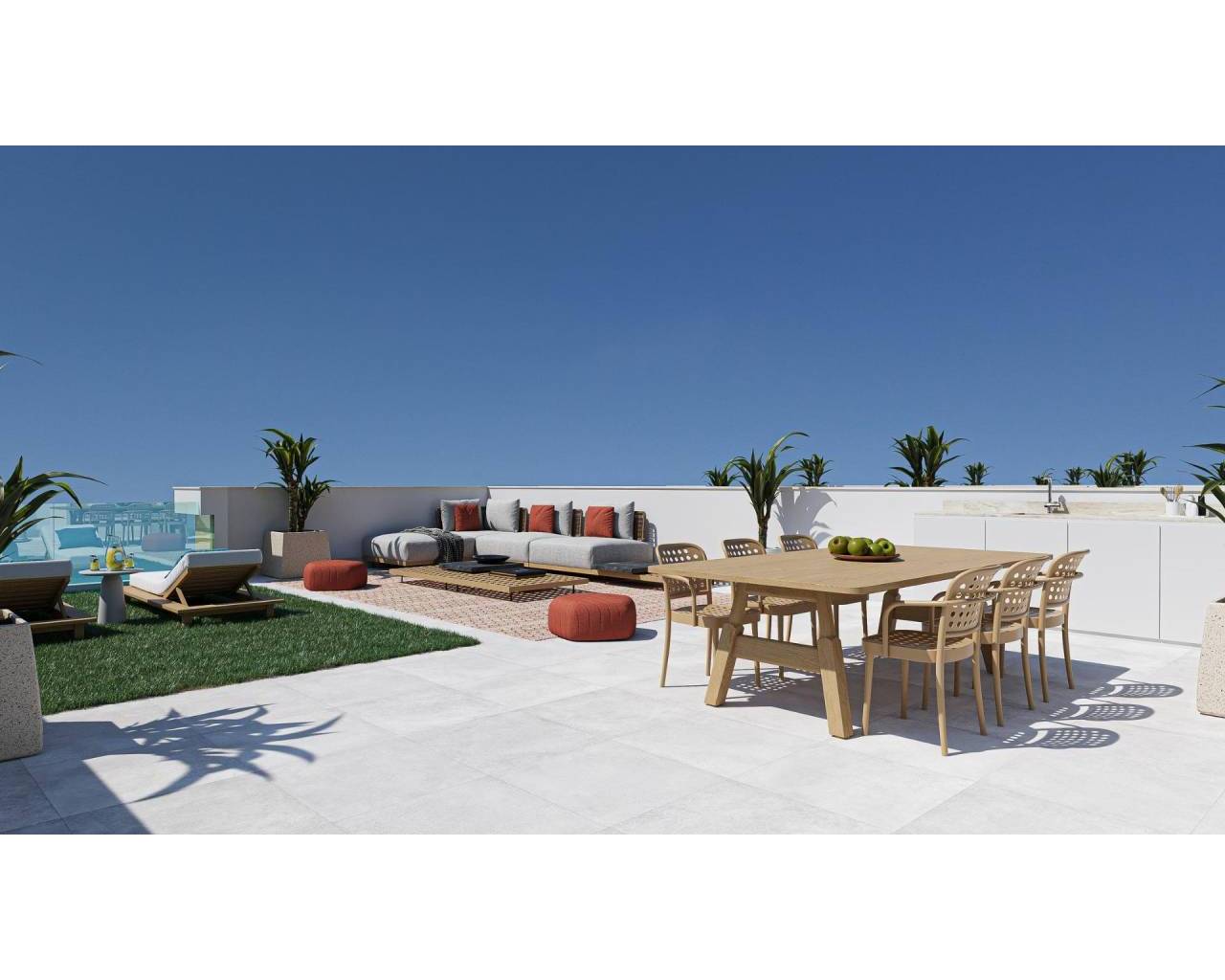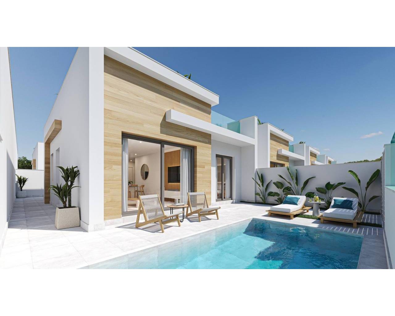 Modern One Level Villas with Private Pool and Solarium in El Jimenado Murcia Contemporary Mediterranean Living with Privacy and Comfort This exclusive development of 6 independent villas is designed to offer maximum privacy, comfort and outdoor living. Located in El Jimenado, a quiet residential area belonging to Torrepacheco in the Murcia region, these elegant one level homes combine modern design with the relaxed Mediterranean lifestyle. Each villa sits on its own plot with private garden, swimming pool, large terraces and on plot parking, allowing you to enjoy sunshine and outdoor living all year round. El Jimenado is known for its peaceful surroundings while being strategically positioned close to golf courses, beaches and essential services, making it ideal for both permanent living and holiday use. Open Plan Design and High Quality Features The villas are thoughtfully designed with an open plan layout where the fully equipped kitchen integrates seamlessly with the bright living and dining area. Large windows connect the interior spaces with the terraces and pool area, creating a natural flow between indoor and outdoor living. Each property includes: Fully furnished kitchen with appliances Bathrooms with mirror, lighting and shower screens Private swimming pool On plot parking space Interior and exterior lighting included except decorative lamps Pre installation of ducted air conditioning Summer kitchen on the private solarium The single level design ensures comfort and accessibility, while the spacious rooftop solarium provides an additional area to relax, entertain and enjoy the sun throughout the year. Peaceful Location Close to Golf and the Coast El Jimenado offers a calm residential environment surrounded by open landscapes and several renowned golf resorts. At the same time, it is well connected to the main towns of the Mar Menor area and the Mediterranean coast. Mar Menor beaches 18 km Mediterranean Sea beaches 25 km Roda Golf 9 km Mar Menor Golf Resort 10 km La Serena Golf 15 km Los Alcazares marina 18 km Murcia Corvera Airport 22 km Alicante Airport 95 km Cartagena city 30 km An Ideal Choice for Lifestyle and Investment Thanks to their modern design, privacy and excellent location, these villas are perfect for those seeking a peaceful home near golf courses and the sea, as well as for buyers looking for a high potential rental investment in the Murcia region. Contact us today to receive more information or to arrange a visit to these beautiful new build villas in El Jimenado. 347